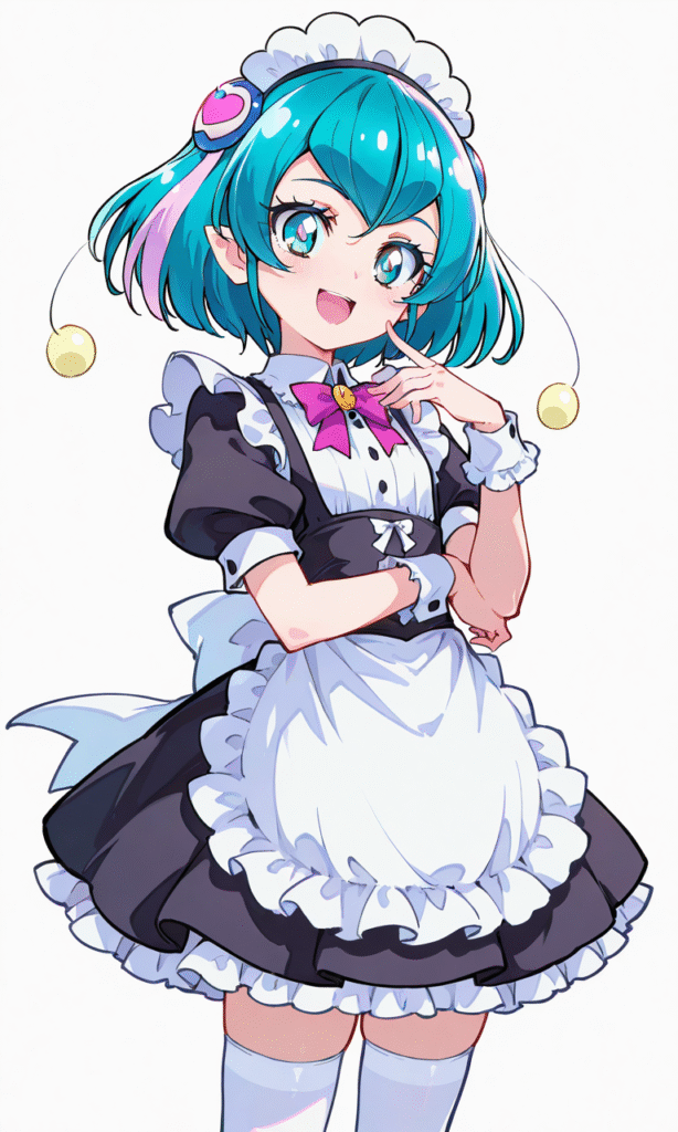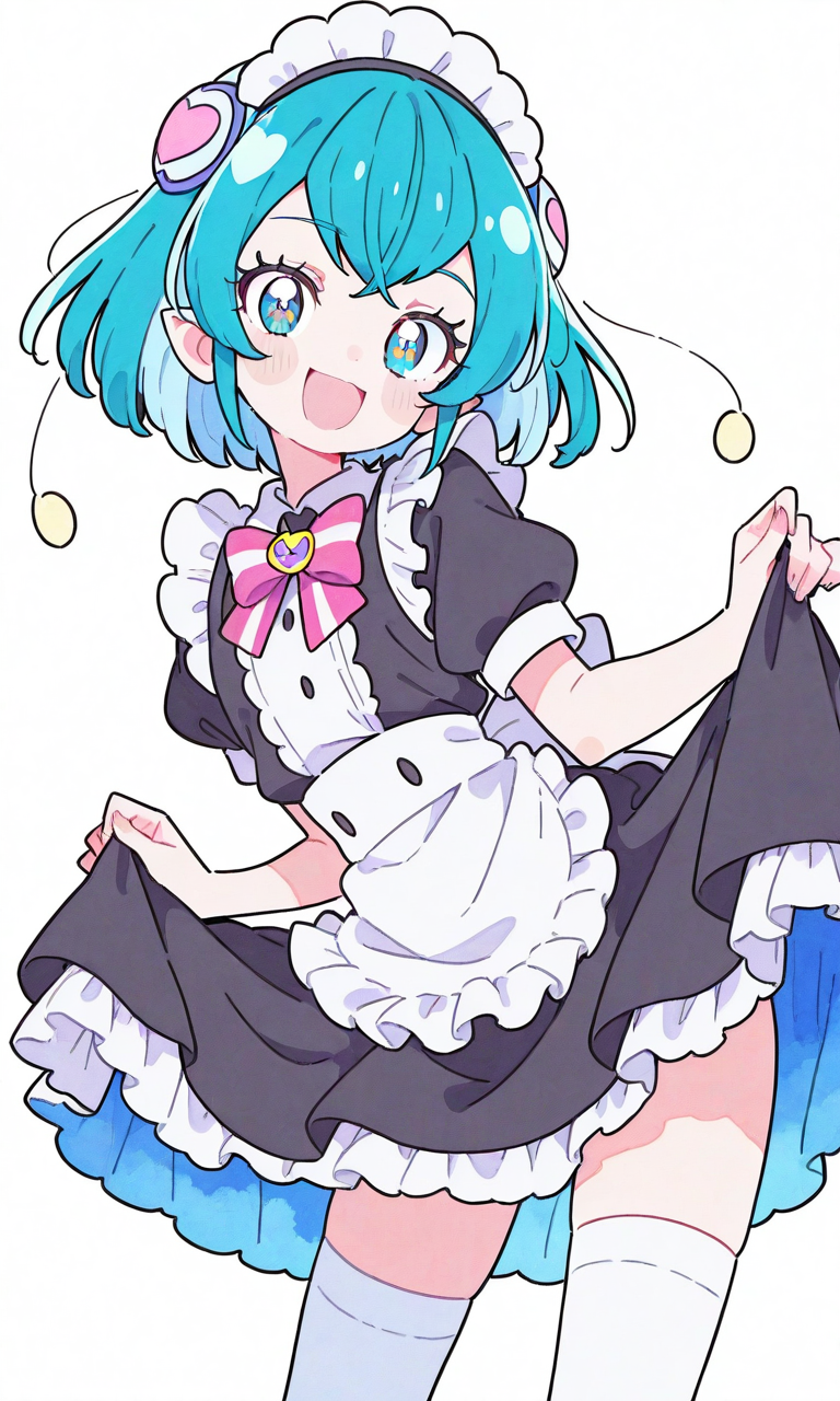 PixAIhagoromo lala(precure),black maid,short sleeves, white thighhighs, cowboy shot,smile,open mouth,skirt hold, looking at viewer, simplebackground,white background, ,usami Style, Flatline, Flat vector illustration, Vivid colors, white thick outline, outline, Blue Inner hair color, watercolor, soft light,
