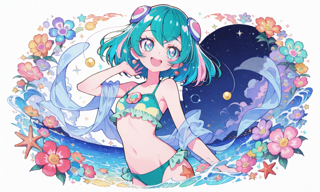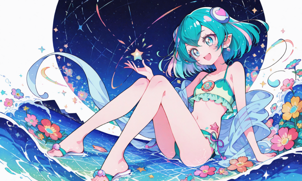 hagoromo lala(precure),green bikini,summer,night sky, star,amanogawa,smile,open mouth, ocean,Starfish,star background,masterpiece,high quality, ,minimalistic line logo, tessellated geometrical design, symmetrical, vectorized, white background, digital style,colored pencil, colorful flowers