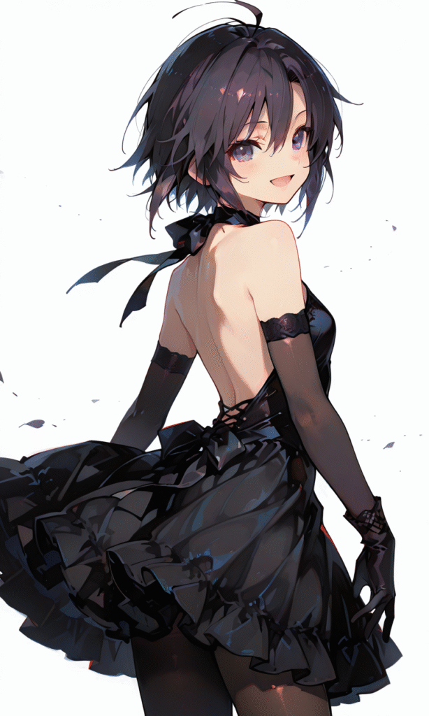 PixAI【Shiitake-Mix】kikuchi makoto, smile,open mouth,black backless dress,pantyhose,black gloves, cowboy shot,simplebackground,white background, masterpiece,high quality, ,tokiame,748cmstyle,hyper-detailed, high contrast, depth of field, ray tracing, best lighting, cinematic composition, beautiful face, beautiful eyes, sharp focus, (masterpiece:1.2), (best quality:1.2), (very aesthetic:1.2), (absurdres:1.2), (detailed background),