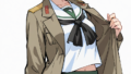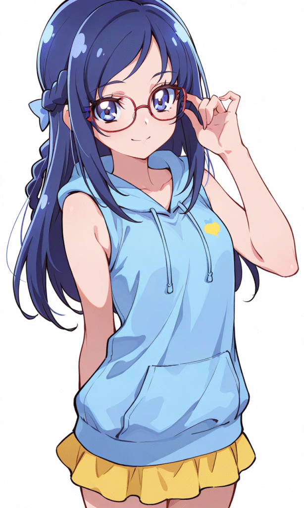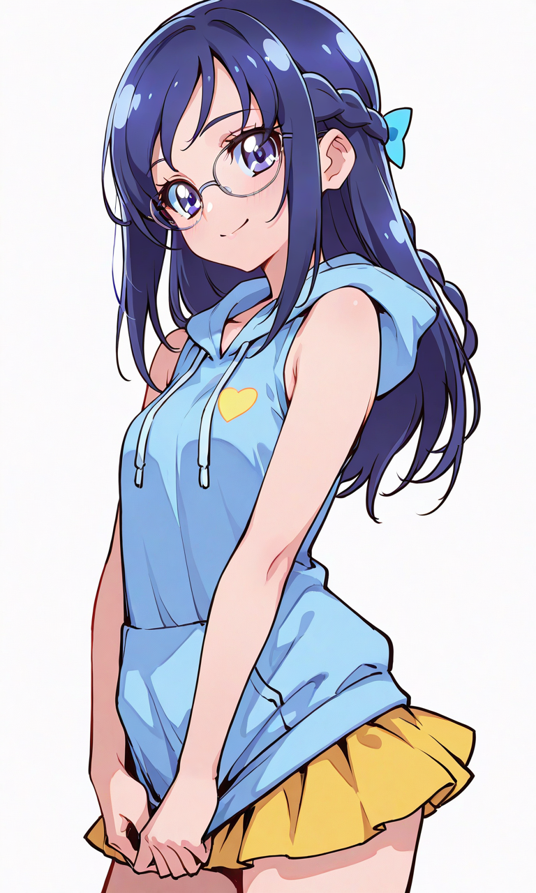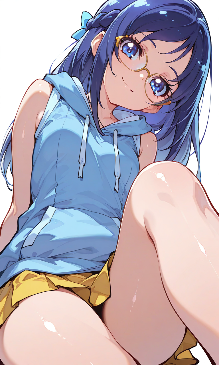 PixAI【Shiitake-Mix】hishikawa rikka(precure),smile,glasses,blue hoodie,sleeveless,yellow miniskirt,sitting, cowboy shot,from below, simplebackground,white background,masterpiece,high quality, ,tokiame,shiny skin, shiny