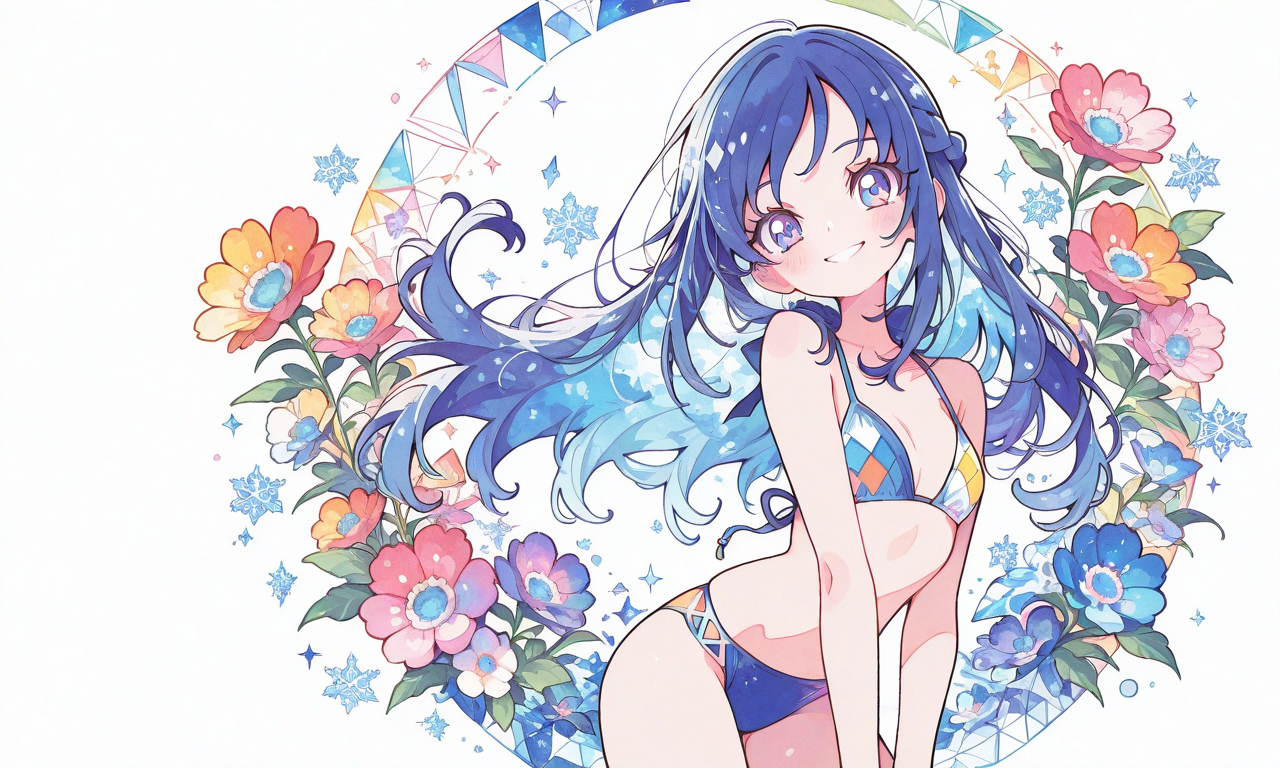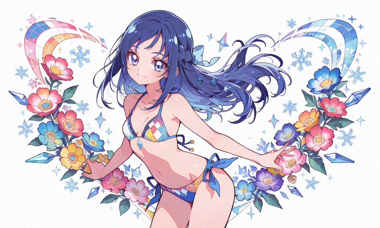 hishikawa rikka(precure),smile,bikini,diamond,crystal,snowflakes,cowboy shot,masterpiece,high quality,