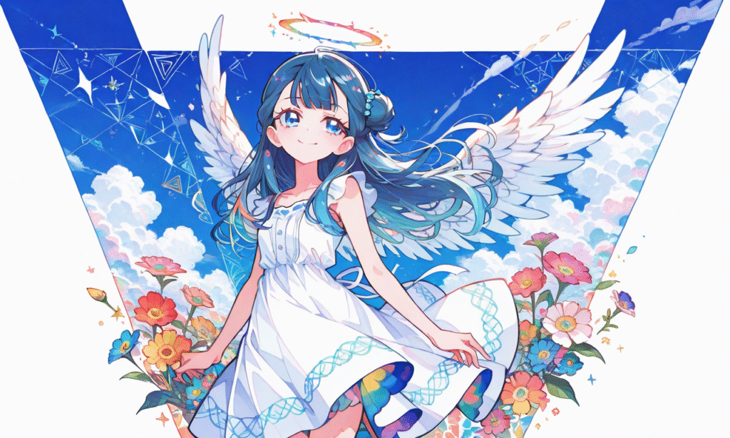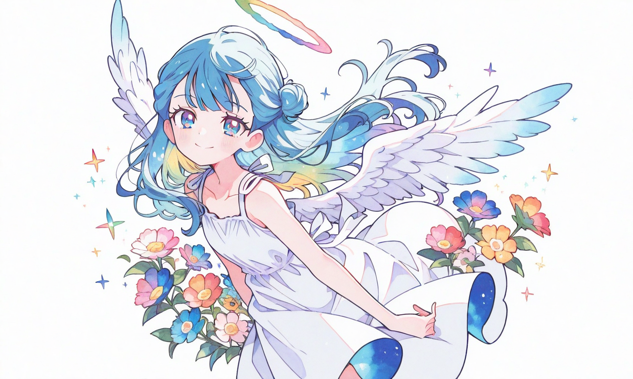 precure,yakushiji saaya,smile,angel wings, sundress, holo,Feather,flying, wind, blue sky, masterpiece,high quality, ,minimalistic line logo, tessellated geometrical design, symmetrical, vectorized, white background, digital style,colored pencil, colorful flowers,usami Style, Flatline, Flat vector illustration, Vivid colors, white thick outline, outline, Blue Inner hair color, watercolor, soft light,