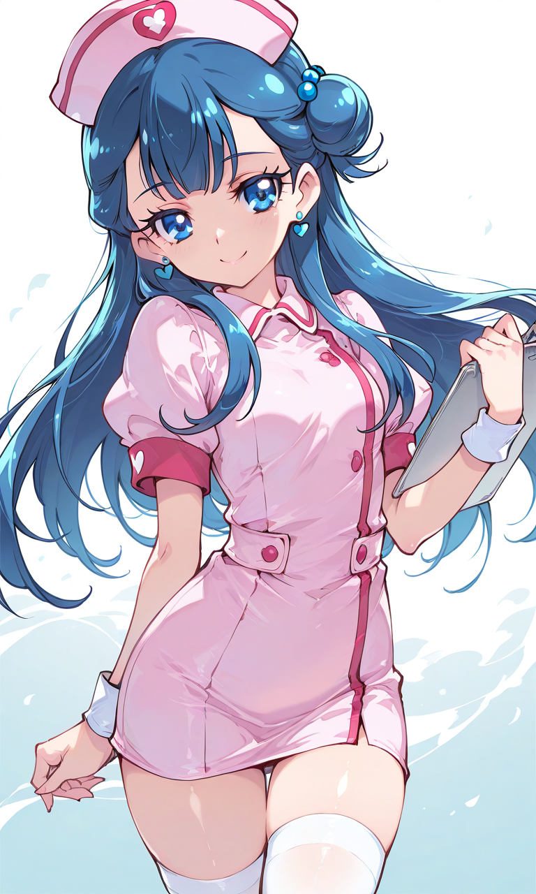 PixAI【Shiitake-Mix】precure,yakushiji saaya,smile,pink nurse,white thighhighs, cowboy shot,masterpiece,high quality, ,tokiame,shiny skin, shiny