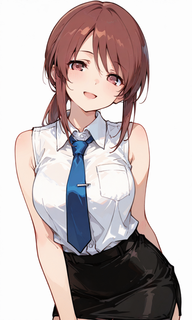 mifune miyu,dress shirt, sleeveless,necktie,pencil skirt, smile,open mouth, cowboy shot,simplebackground,white background, masterpiece,high quality, high resolution,tokiame,748cmstyle