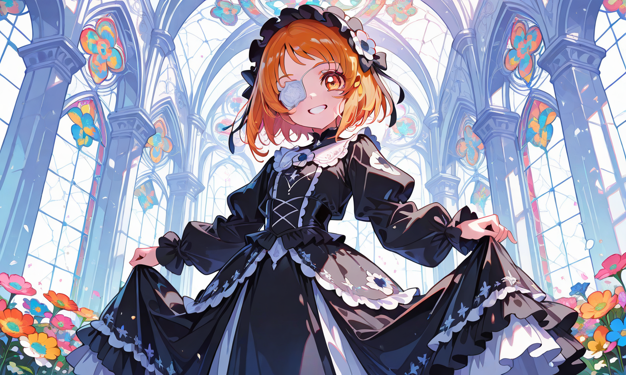 PixAI【Shiitake-Mix】shirabe ako(precure),loli,solo,short hair,orange hair,orange eyes, gothic lolita,long skirt, white eyepatch,grin,cowboy shot,church,stainedglass masterpiece,high quality, ,((4k,8k,Ultra HD)),((Masterpiece :1.2)),((Best quality :1.2)),((Detailed :1.5)),((Detailed background :1.5)),minimalistic line logo, tessellated geometrical design, symmetrical, vectorized, white background, digital style,colored pencil, colorful flowers