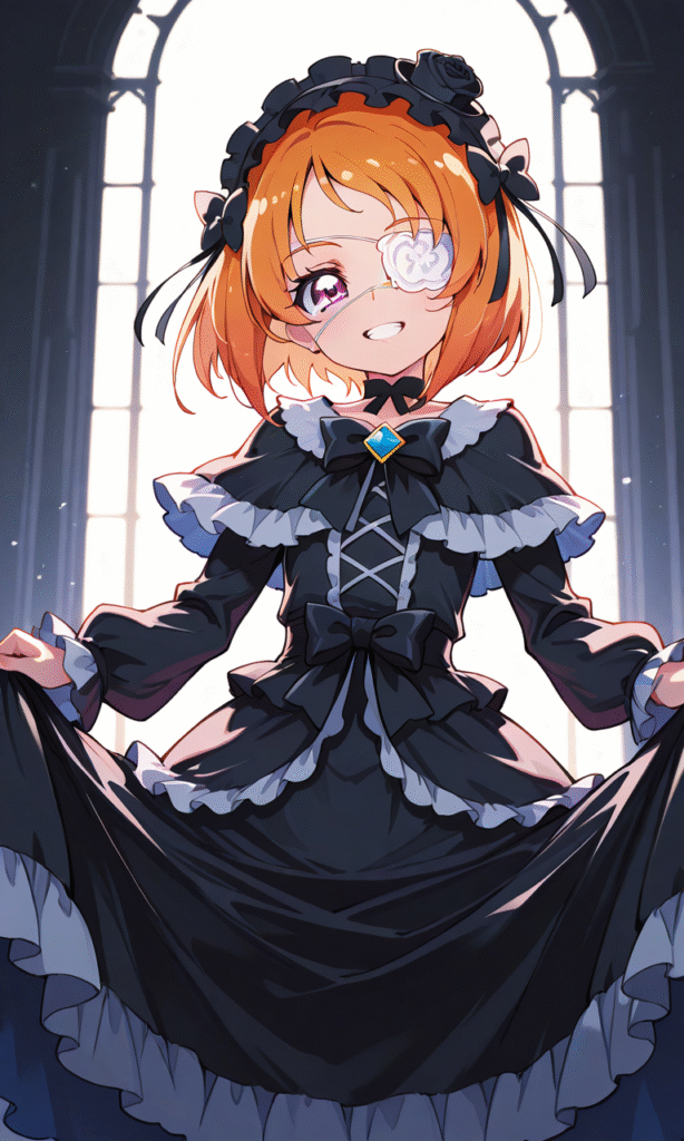 shirabe ako(precure),loli,solo,short hair,orange hair,gothic lolita,long skirt, white eyepatch,grin,cowboy shot,simplebackground,white background, masterpiece,high quality, ,tokiame,cinematic lighting , cinematic angle, soft light , color detail, backlighting, Depth of field, long exposure, light steps, intricate colors, vibrant colors,