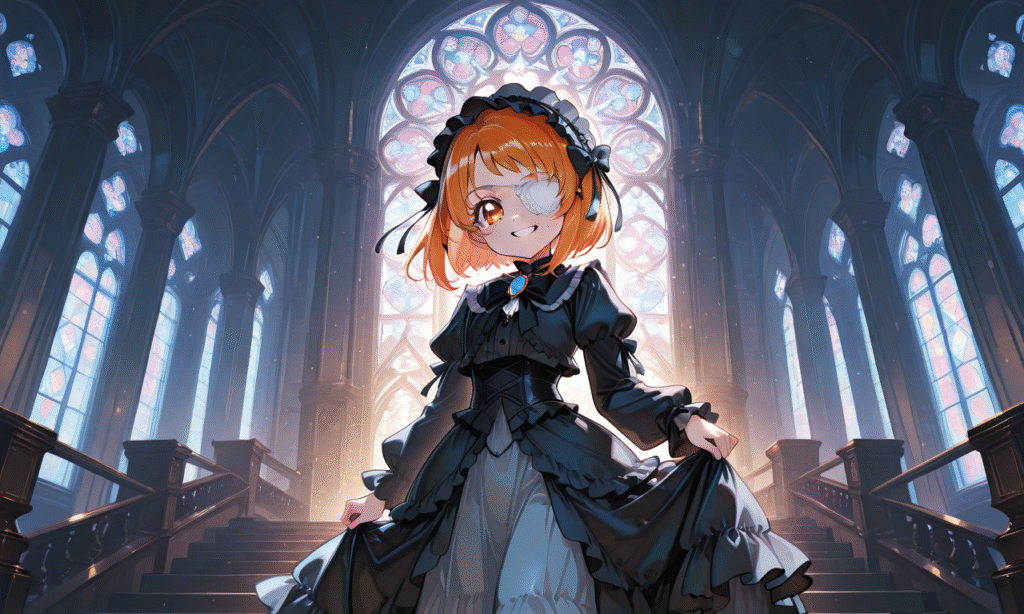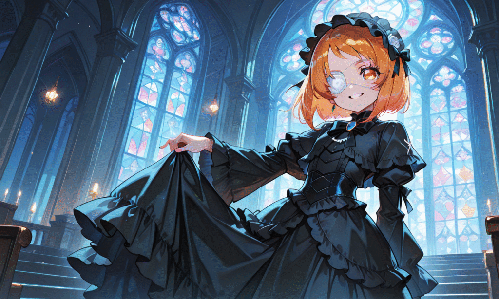 shirabe ako(precure),loli,solo,short hair,orange hair,orange eyes, gothic lolita,long skirt, white eyepatch,grin,cowboy shot,church,stainedglass masterpiece,high quality, ,tokiame,cinematic lighting , cinematic angle, soft light , color detail, backlighting, Depth of field, long exposure, light steps, intricate colors, vibrant colors,((4k,8k,Ultra HD)),((Masterpiece :1.2)),((Best quality :1.2)),((Detailed :1.5)),((Detailed background :1.5)),Mblanc