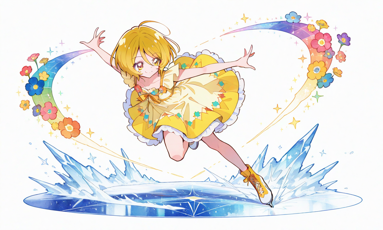 precure,kagayaki homare, solo,ahige,smile,figure skating,yellow sundress,Skating rink,ice,star (sky), spread arms,standing on one leg,star background,masterpiece,high quality, ,minimalistic line logo, tessellated geometrical design, symmetrical, vectorized, white background, digital style,colored pencil, colorful flowers