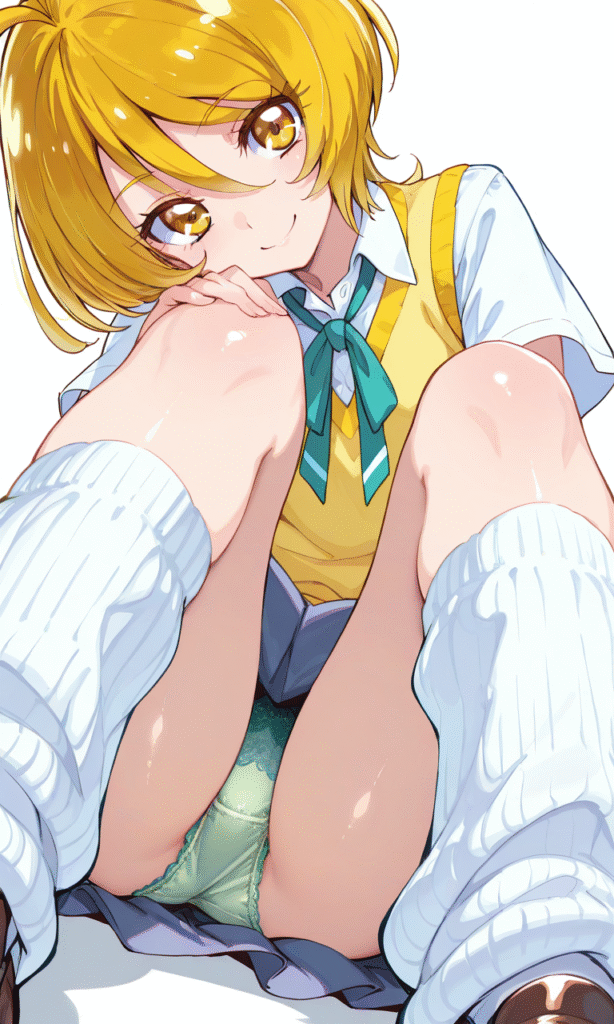 PixAI【Shiitake-Mix】precure,kagayaki homare, solo,ahige,smile,school uniform, dress shirt, short sleeves, neck ribbon, wool vest,miniskirt,loose socks,looking at viewer,from below,sitting,panty shot,green lace panties simplebackground,white background, masterpiece,high quality, ,shiny skin, shiny,tokiame
