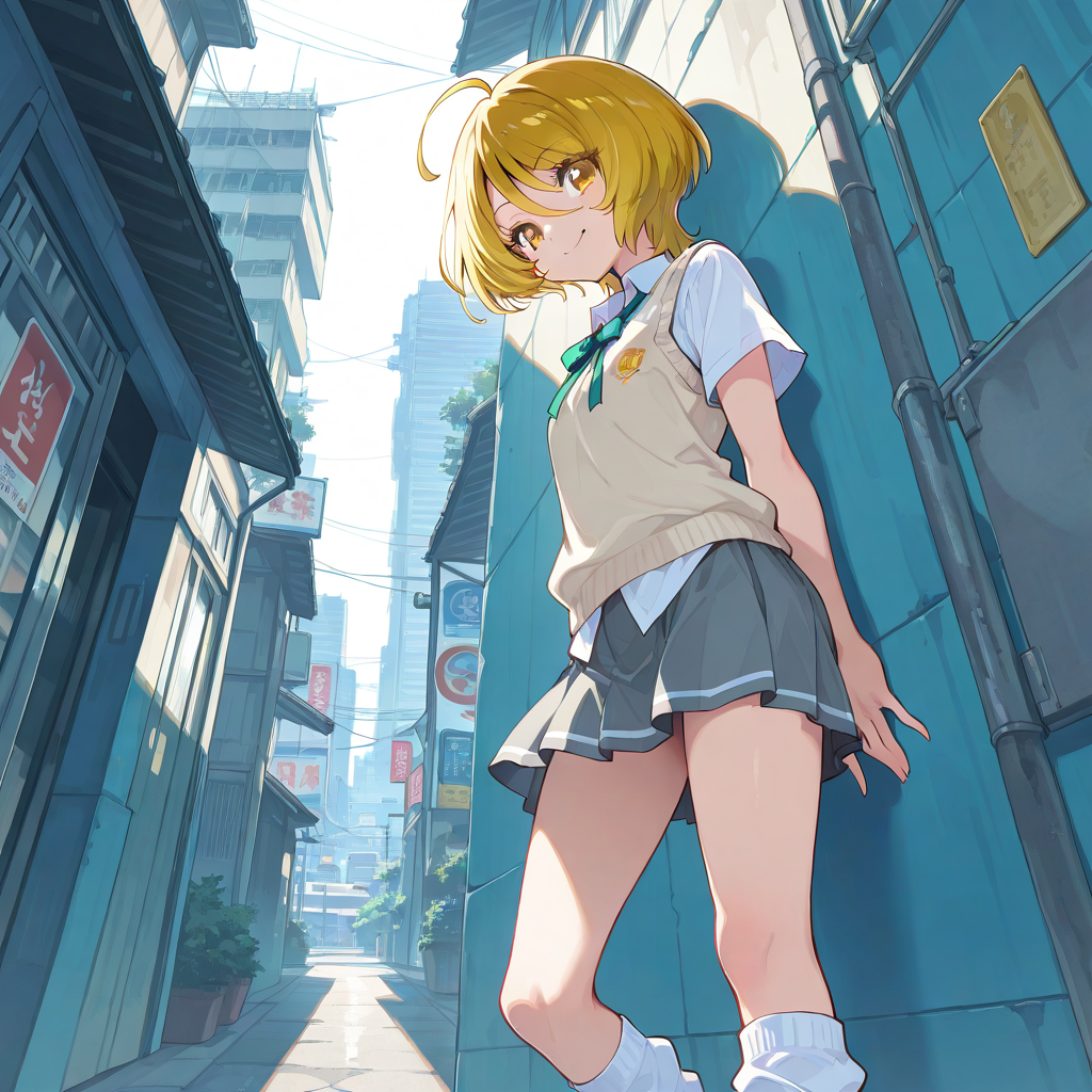 precure,kagayaki homare, solo,ahige,smile,school uniform, dress shirt, short sleeves, neck ribbon, wool vest,miniskirt,loose socks,standing against the wall,looking at viewer,tokyo city,from below, masterpiece,high quality, ,tokiame,((4k,8k,Ultra HD)),((Masterpiece :1.2)),((Best quality :1.2)),((Detailed :1.5)),((Detailed background :1.5))