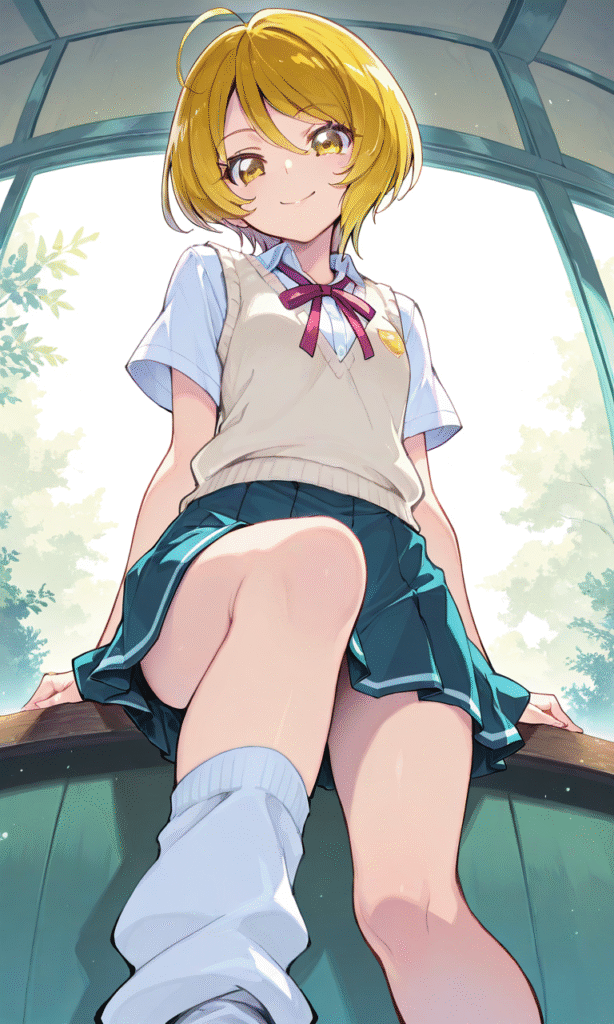 precure,kagayaki homare, solo,ahige,smile,school uniform, dress shirt, short sleeves, neck ribbon, wool vest,miniskirt,loose socks,looking at viewer,from below, masterpiece,high quality, ,tokiame,((4k,8k,Ultra HD)),((Masterpiece :1.2)),((Best quality :1.2)),((Detailed :1.5)),((Detailed background :1.5))