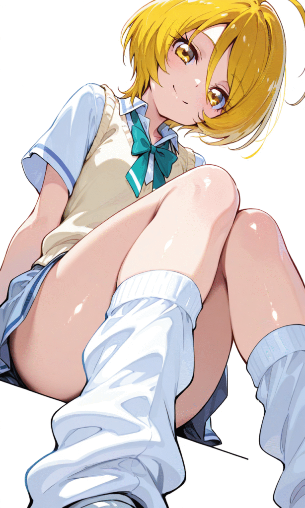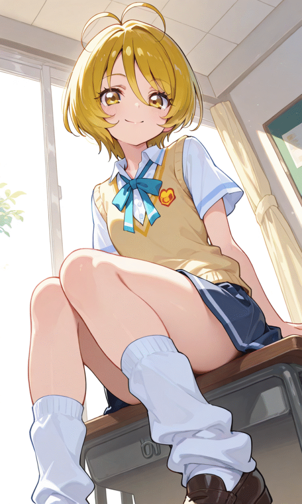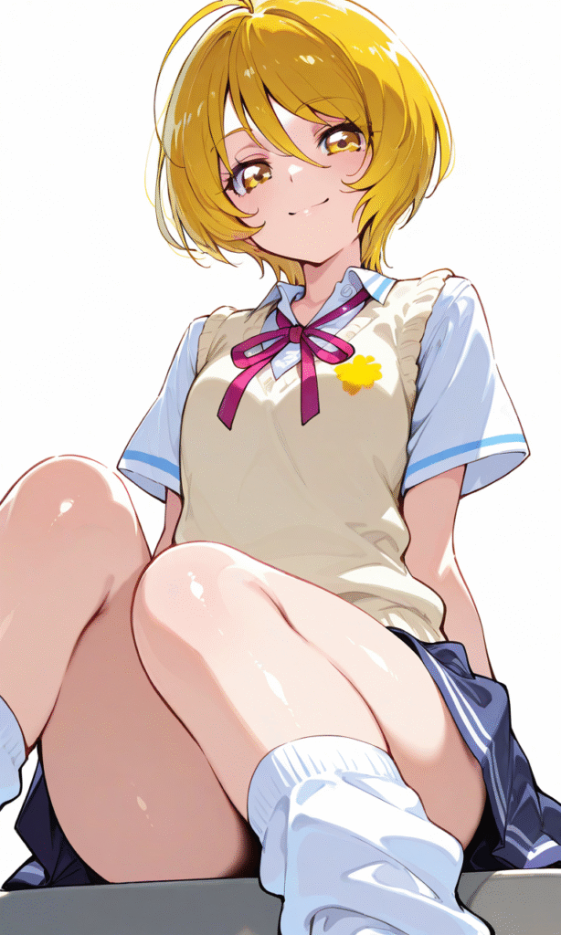 precure,kagayaki homare, solo,ahige,smile,school uniform, dress shirt, short sleeves, neck ribbon, wool vest,miniskirt,loose socks,looking at viewer,from below,sitting, simplebackground,white background, masterpiece,high quality, ,tokiame,((4k,8k,Ultra HD)),((Masterpiece :1.2)),((Best quality :1.2)),((Detailed :1.5)),((Detailed background :1.5))