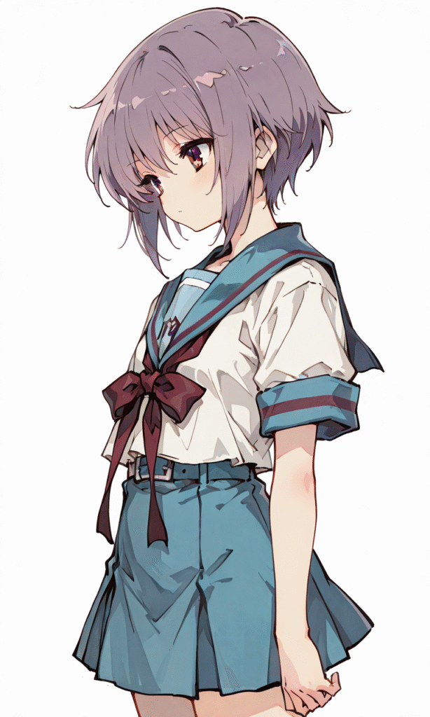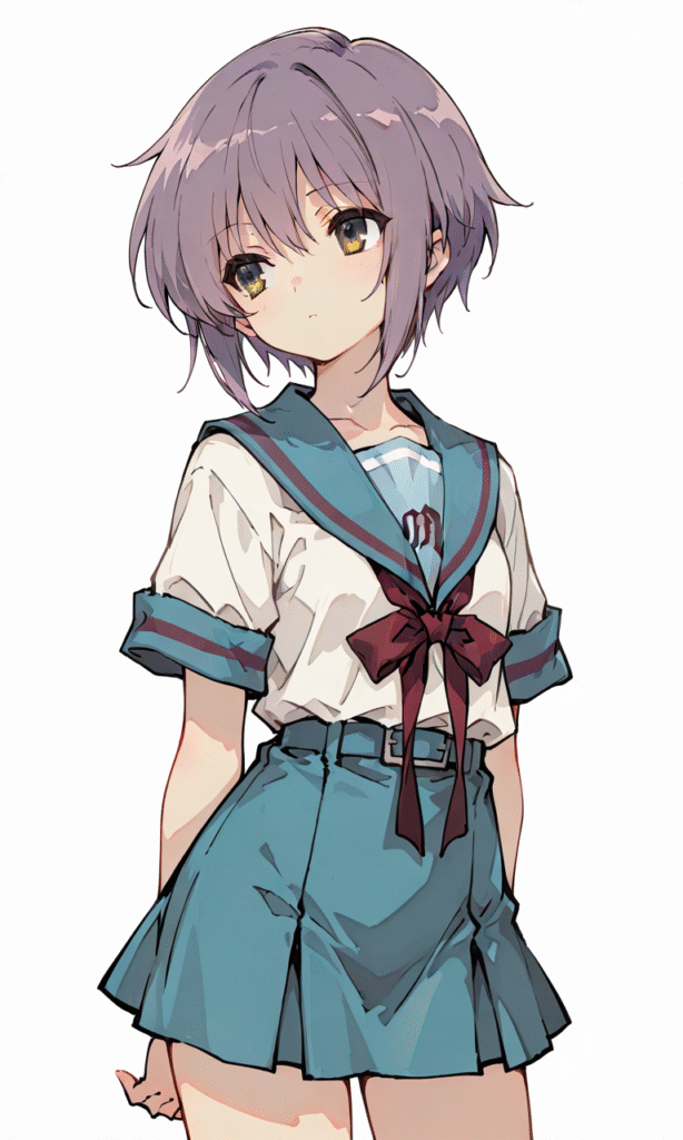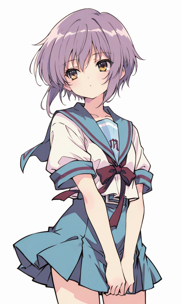 PixAI【Shiitake-Mix】nagato yuki, serafuku,short sleeves, cowboy shot,simplebackground,white background, masterpiece,high quality, ,tokiame,pastel style,748cmstyle,Flat color, anime screencap