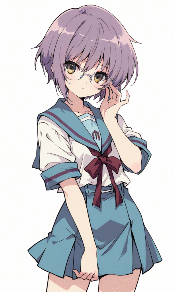 nagato yuki, serafuku,short sleeves,glasses,looking at viewer, adjusting_eyewear, cowboy shot,simplebackground,white background, masterpiece,high quality, ,tokiame,pastel style,748cmstyle,Flat color, anime screencap