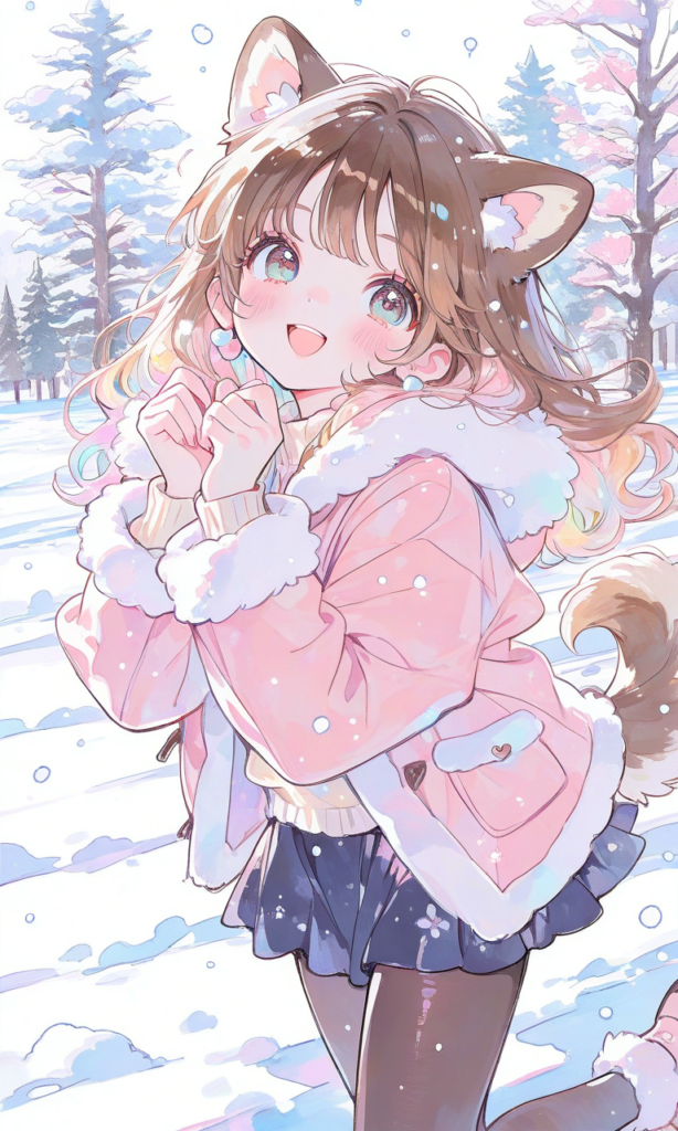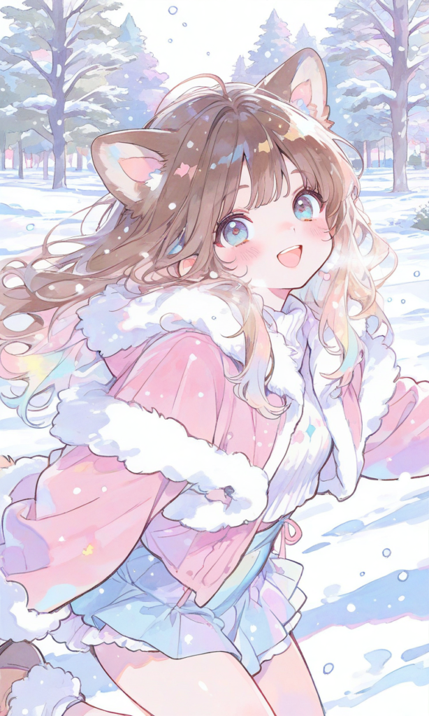 1girl, dog ears, solo, brown hair, fur-trimmed coat, miniskirt, panties, running, skipping, snowing, tree, snow field, winter, smile, open mouth, cowboy shot, simple background, white background, masterpiece, high quality, high resolution, high-res, ♡masterpiece, highest quality, ♡, cute, pencil lines, sketch, kawaii, watercolor, sketch style, watercolor effect, pastel colors