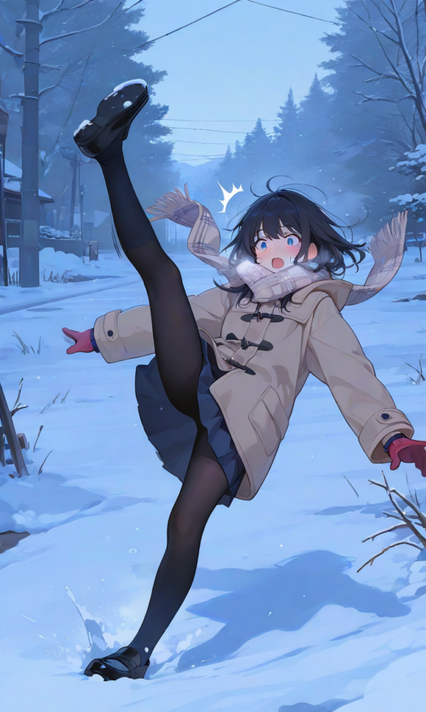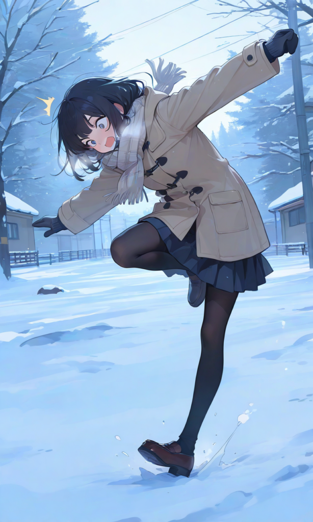 PixAI【Shiitake-Mix】1girl, school_uniform, surprised, open_mouth, slipping, falling, cold, snow, spread_arms, lose_balance, duffel_coat, scarf, leg_up, kick, full_body, masterpiece, high_quality, high_resolution, 748cmstyle, (4k,8k,Ultra HD), (Masterpiece:1.2), (Best quality:1.2), (Detailed:1.5), (Detailed background:1.5)