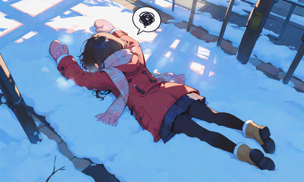 girl,school uniform, on stomach,from behind, cold,arms up, snow,street,red duffel coat, scarf,mittens gloves, full body,spoken squiggle, from above, faceplant,dutch angle, sunlight, masterpiece,high quality, high resolution,748cmstyle,((4k,8k,Ultra HD)),((Masterpiece :1.2)),((Best quality :1.2)),((Detailed :1.5)),((Detailed background :1.5)),neon pop art style