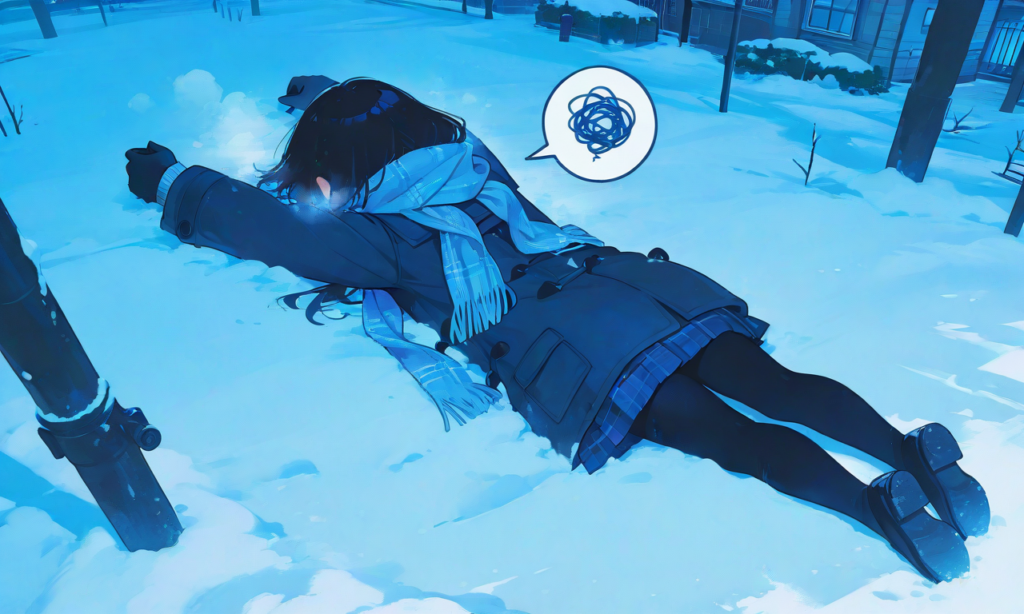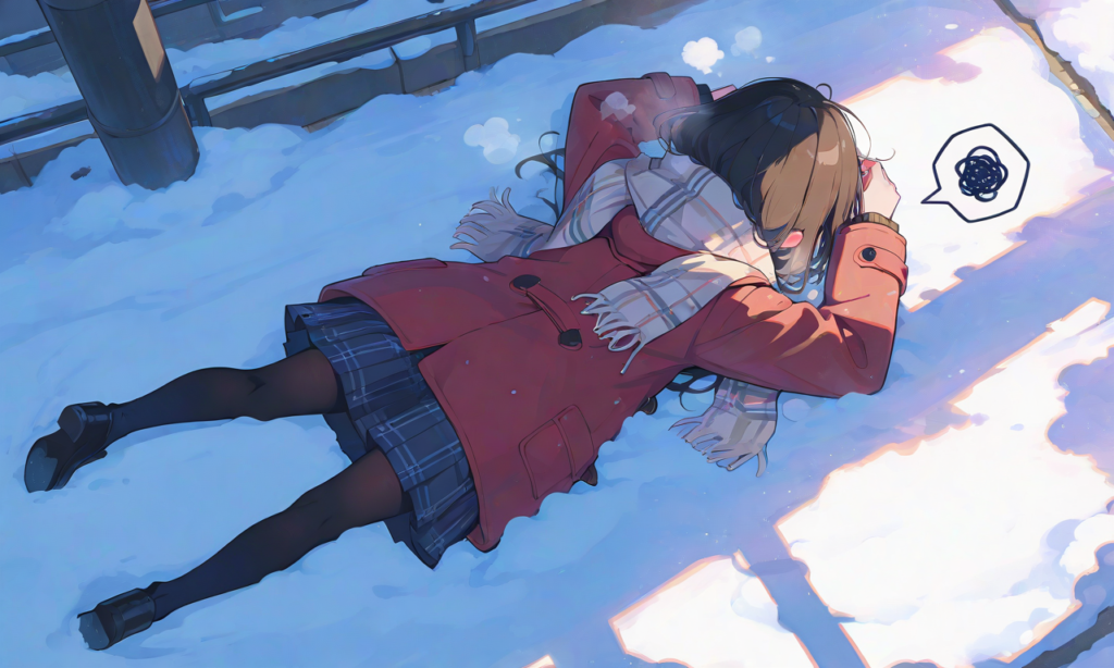 girl,school uniform, on stomach,from behind, cold,arms up, snow,duffel coat, scarf, full body,spoken squiggle, from above, faceplant,dutch angle, masterpiece,high quality, high resolution,748cmstyle,((4k,8k,Ultra HD)),((Masterpiece :1.2)),((Best quality :1.2)),((Detailed :1.5)),((Detailed background :1.5)),neon pop art style