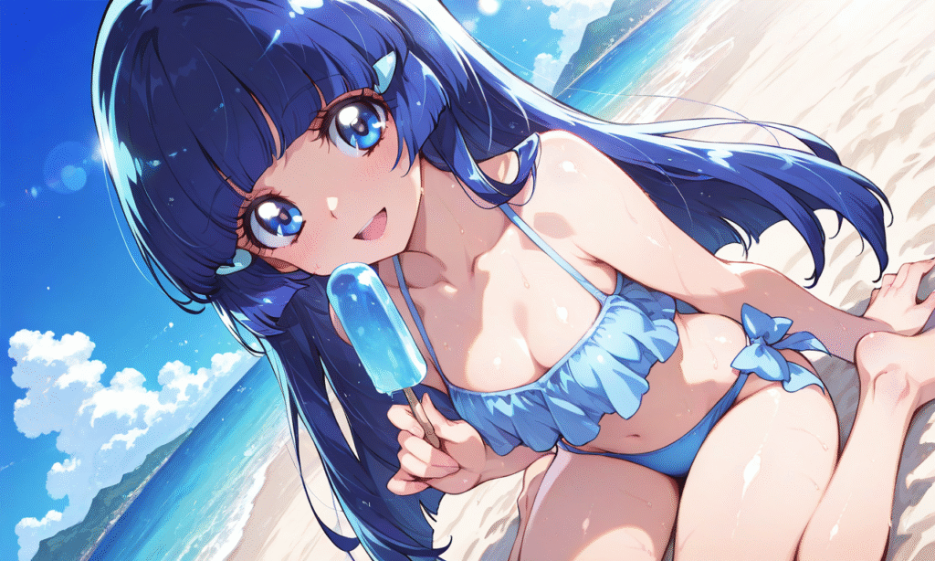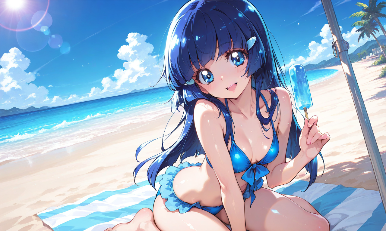 PixAI【Shiitake-Mix】aoki reika(precure), smile, open mouth, blue bikini, wariza, ice candy, looking at viewer, summer, beach, blue sky, heavy lens flare, masterpiece, high quality, shiny skin, shiny, tokiame, 4k, 8k, Ultra HD, Masterpiece, Best quality, Detailed, Detailed background