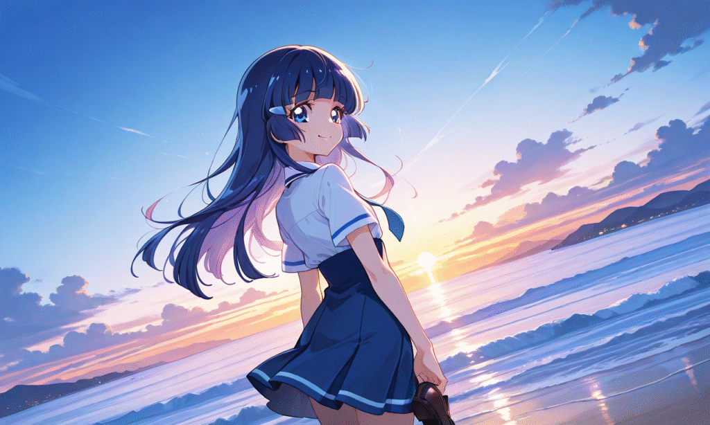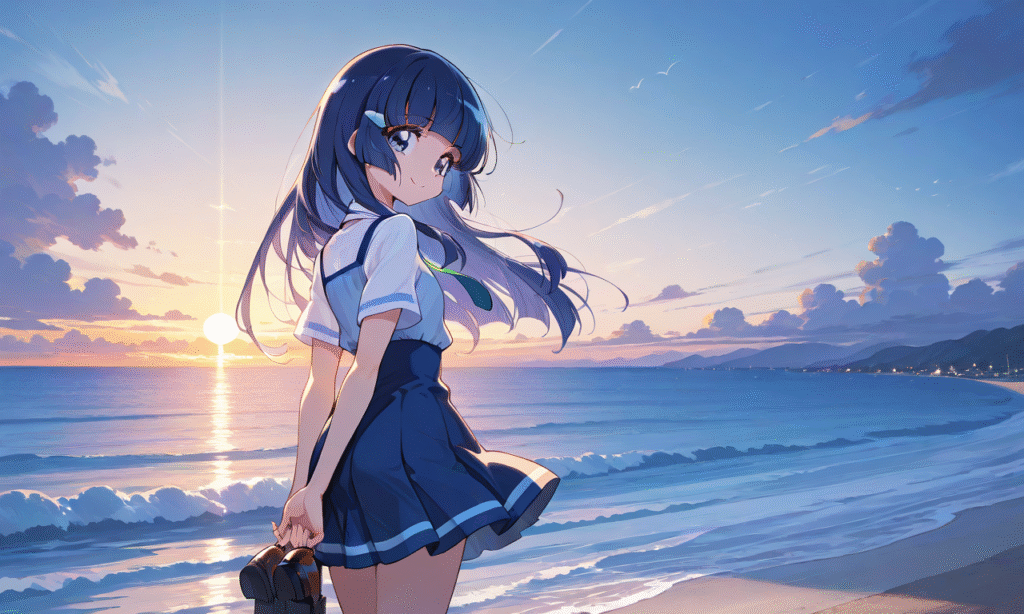 the anime character is shown standing on an ocean shoreline, holding loafers, 1girl, aoki reika(precure), solo, nanairogaoka middle school uniform, short sleeves, smile,summer,sunset,backlighting, cowboy shot,looking back, masterpiece,high quality, ,tokiame,((4k,8k,Ultra HD)),((Masterpiece :1.2)),((Best quality :1.2)),((Detailed :1.5)),((Detailed background :1.5)),cinematic lighting , cinematic angle, soft light , color detail, backlighting, Depth of field, long exposure, light steps, intricate colors, vibrant colors,