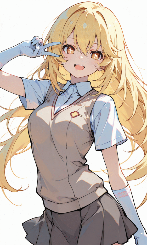 PixAI【Shiitake-Mix】shokuhou misaki, tokiwadai school uniform, no necktie, short sleeves, elbow gloves, v, smile, open mouth, cowboy shot, simple background, white background, masterpiece, high quality, high resolution, tokiame, hyper-detailed, high contrast, depth of field, ray tracing, best lighting, cinematic composition, beautiful face, beautiful eyes, sharp focus, (masterpiece:1.2), (best quality:1.2), (very aesthetic:1.2), (absurdres:1.2), (detailed background), flat color style, simple coloring style, tokiame, hyper-detailed, high contrast, depth of field, ray tracing, best lighting, cinematic composition, beautiful face, beautiful eyes, sharp focus, (masterpiece:1.2), (best quality:1.2), (very aesthetic:1.2), (absurdres:1.2), (detailed background), flat color style, simple coloring style