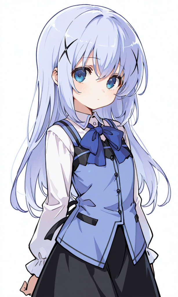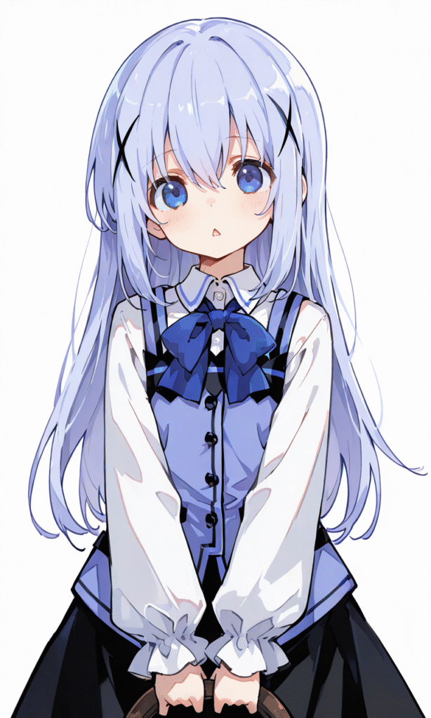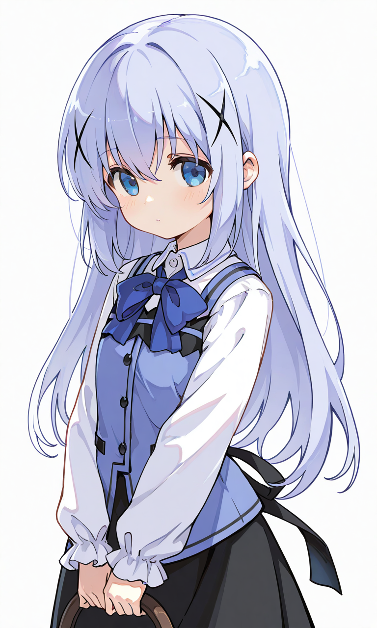 PixAI【Shiitake-Mix】kafuu chino, rabbit house uniform, triangle mouth, cowboy shot,simplebackground,white background, masterpiece,high quality, ,tokiame,748cmstyle