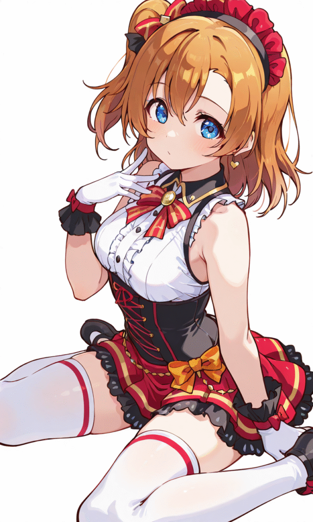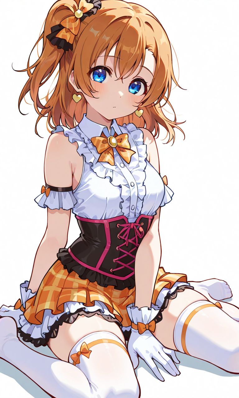 PixAI【Shiitake-Mix】kosaka honoka(lovelive),corset,gloves, white thighhighs, wariza,looking at viewer, simplebackground,white background, masterpiece,high quality, ,tokiame