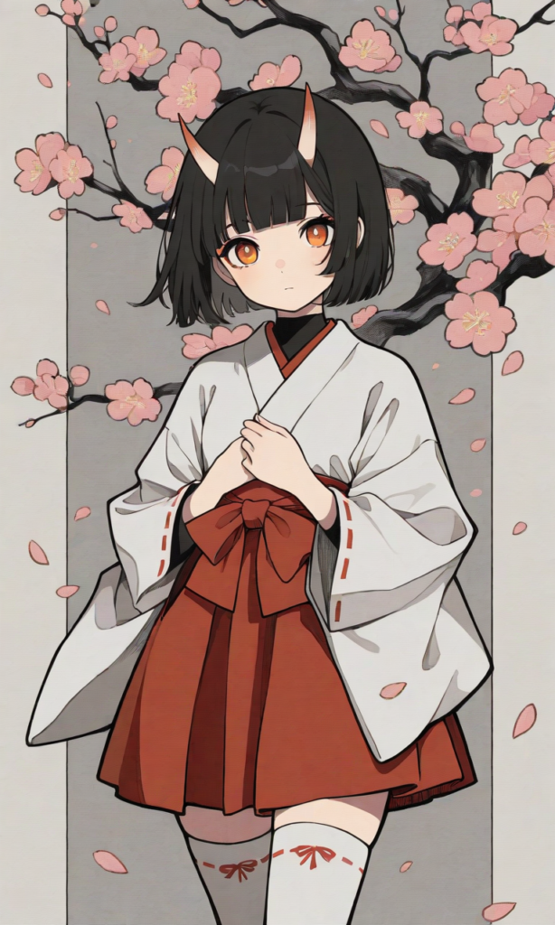 1girl, flat color, cel shading, oni, solo, black hair, short hair, blunt bangs, amber eyes, tareme, miko, miniskirt, white thighhighs, cowboy shot, japanese pattern background, minimalism, plum tree, floating cherry blossom petals, deep depth of field, masterpiece, high quality, looking at viewer, high resolution, high-res, black and grey, crosshatching, dark aesthetic, clean, background texture, bold outline, abstract, cropped, cropped background, ultra detailed