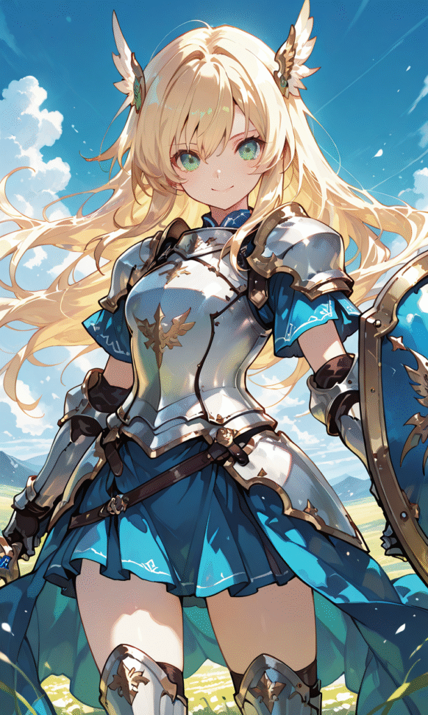 1girl, blonde hair, long hair, green eyes, armored dress, silver armor, blue dress, short sleeves, miniskirt, wing hair ornament, armored legwear, gauntlet, smile, looking at viewer, blue sky, cowboy shot, masterpiece, high quality, high resolution, large shield, blue shield, serious, hyper-detailed, high contrast, depth of field, ray tracing, best lighting, cinematic composition, beautiful face, beautiful eyes, sharp focus, (masterpiece:1.2), (best quality:1.2), (very aesthetic:1.2), (absurdres:1.2), (detailed background), tokiame, Fantasy Scene