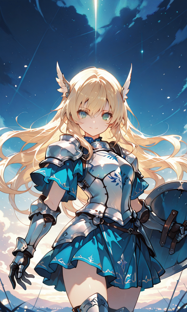 1girl, blonde hair, long hair, green eyes, armored dress, silver armor, blue dress, short sleeves, miniskirt, wing hair ornament, armored legwear, gauntlet, smile, looking at viewer, blue background, night sky, cowboy shot, masterpiece, high quality, high resolution, large shield, blue shield, serious, hyper-detailed, high contrast, depth of field, ray tracing, best lighting, cinematic composition, beautiful face, beautiful eyes, sharp focus, (masterpiece:1.2), (best quality:1.2), (very aesthetic:1.2), (absurdres:1.2), (detailed background), tokiame, Fantasy Scene, hyper-detailed, high contrast, depth of field, ray tracing, best lighting, cinematic composition, beautiful face, beautiful eyes, sharp focus, (masterpiece:1.2), (best quality:1.2), (very aesthetic:1.2), (absurdres:1.2), (detailed background), tokiame, Fantasy Scene