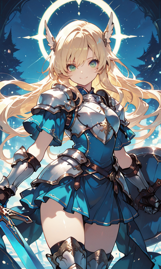 PixAI【Shiitake-Mix】1girl, blonde hair, long hair, green eyes, armored dress, silver armor, blue dress, short sleeves, miniskirt, wing hair ornament, armored legwear, gauntlet, smile, looking at viewer, cowboy shot, masterpiece, high quality, high resolution, large shield, blue shield, serious, blue night, hyper-detailed, high contrast, depth of field, ray tracing, best lighting, cinematic composition, beautiful face, beautiful eyes, sharp focus, (masterpiece:1.2), (best quality:1.2), (very aesthetic:1.2), (absurdres:1.2), (detailed background), tokiame, Fantasy Scene