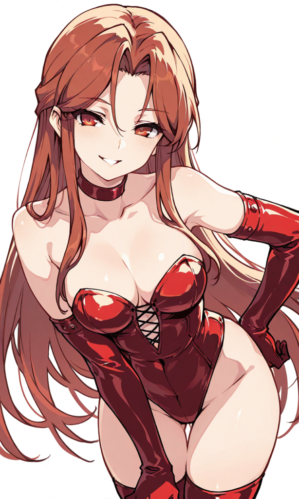 zaizen tokiko,red dominatrix,grin,hand on own hip, looking at viewer, open mouth, cowboy shot,simplebackground,white background, masterpiece,high quality, ,tokiame