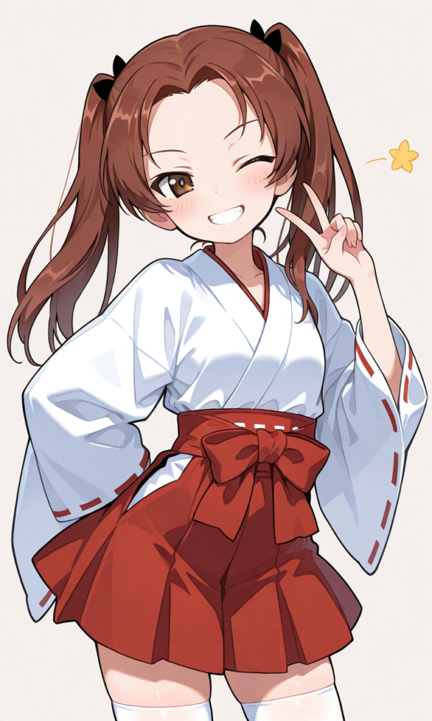 PixAI【Shiitake-Mix】1girl, kadotani anzu(GIRLS und PANZER), miko, looking at viewer, white thighhighs, grin, cowboy shot, simple background, one eye closed, masterpiece, high quality, neon pop art style