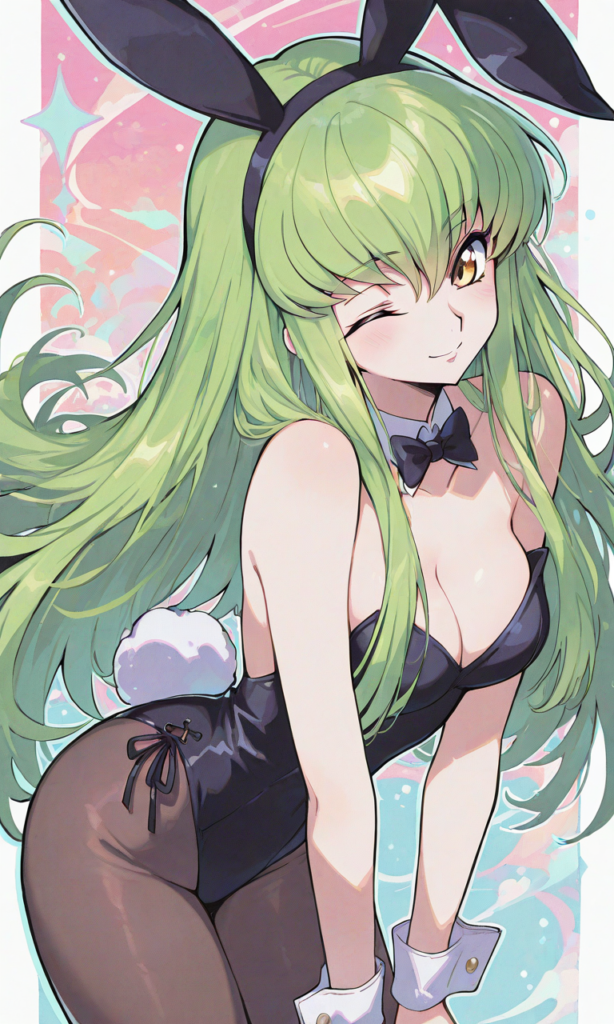 PixAI【Shiitake-Mix】C.C.,code geass,bunnygirl,pantyhose,smile,one eye closed, leaning forward,cowboy shot,masterpiece,high quality, high resolution,high-res,♡masterpiece, highest quality, ♡,neon pop art style,