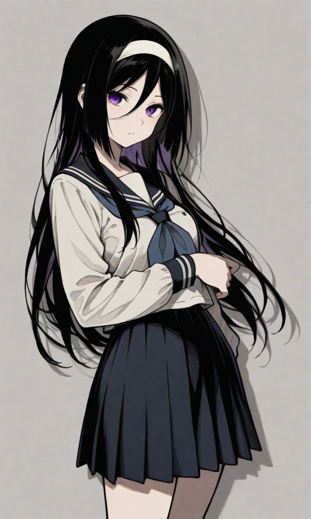 irisu fuyumi,1girl, kamiyama high school uniform (hyouka),long sleeves,black hair, purple eyes, looking at viewer,expressionless, hairband, cowboy shot,drop shadow, masterpiece,high resolution,high quality, ,high-res,Black and Grey, crosshatching, dark aesthetic, clean, background texture, bold outline, abstract, cropped, cropped background, ultra detailed