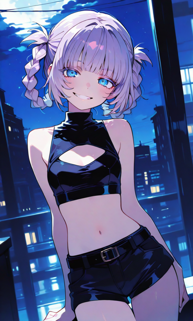 PixAI【Shiitake-Mix】nanakusa nazuna (yofukashi no uta),grin, cloak,black thighhighs, cowboy shot,masterpiece,high resolution,high quality, night sky, high-res,nazunaxl, purple hair, cleavage cutout, shorts, clothing cutout, crop top, sleeveless, turtleneck, navel, hair rings, blue eyes, black shorts, small breasts, braided hair rings, short shorts, belt, ringed eyes, short hair, blunt bangs,hyper-detailed, high contrast, depth of field, ray tracing, best lighting, cinematic composition, beautiful face, beautiful eyes, sharp focus, (masterpiece:1.2), (best quality:1.2), (very aesthetic:1.2), (absurdres:1.2), (detailed background),(watercolor_(medium):1.2)(simple coloring,flat color:2)dutch angle
