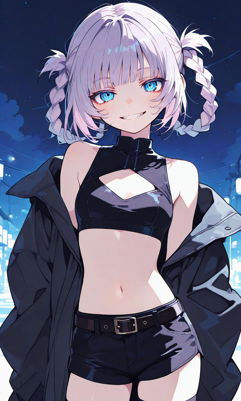 PixAI【Shiitake-Mix】nanakusa nazuna (yofukashi no uta),grin, cloak,black thighhighs, cowboy shot,masterpiece,high resolution,high quality, night sky, high-res,nazunaxl, purple hair, cleavage cutout, shorts, clothing cutout, crop top, sleeveless, turtleneck, navel, hair rings, blue eyes, black shorts, small breasts, braided hair rings, short shorts, belt, ringed eyes, short hair, blunt bangs,hyper-detailed, high contrast, depth of field, ray tracing, best lighting, cinematic composition, beautiful face, beautiful eyes, sharp focus, (masterpiece:1.2), (best quality:1.2), (very aesthetic:1.2), (absurdres:1.2), (detailed background),(watercolor_(medium):1.2)(simple coloring,flat color:2)dutch angle