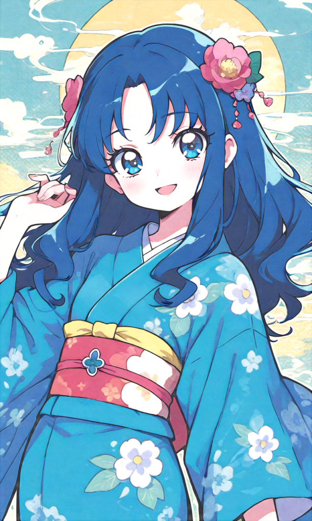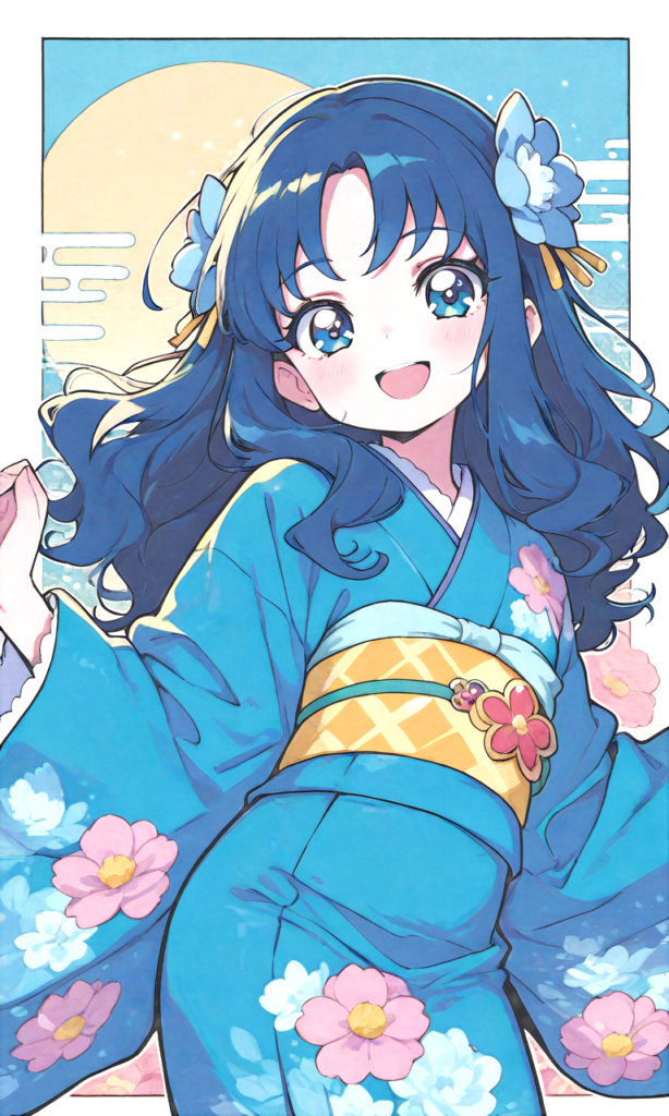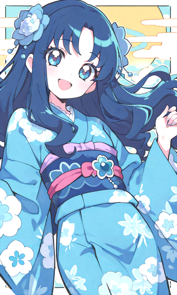PixAI【Shiitake-Mix】kurumi erika(precure),solo,ellipse eyes,big eyes, smile,open mouth,blue kimono, flower print,smile,open mouth, cowboy shot,masterpiece,high quality,high resolution, ,high-res,Anime, moe,♡masterpiece, highest quality, ♡,neon pop art style,sketch_style, black_line, flat_color, 2D_image, clear_lines
