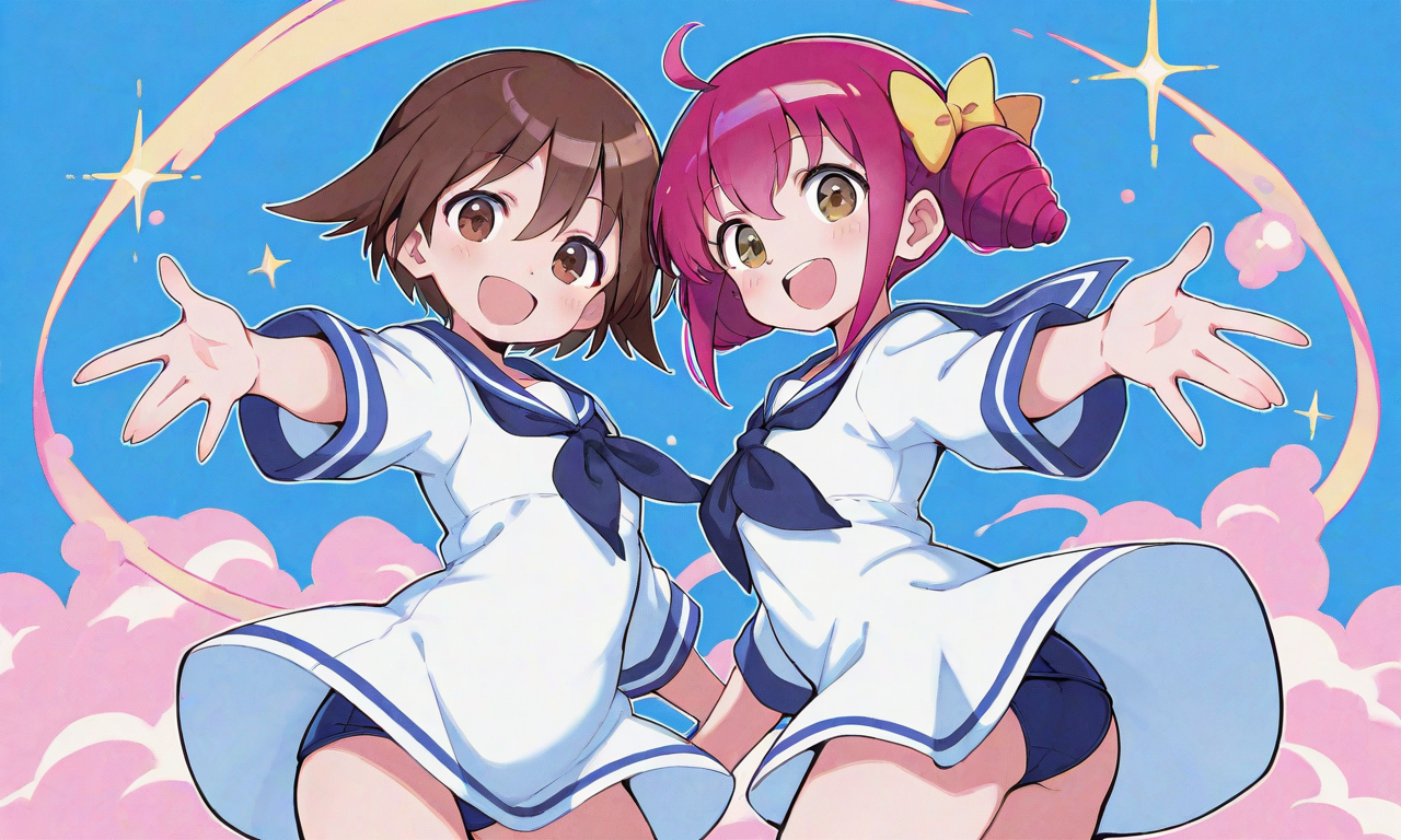 PixAI【Shiitake-Mix】2girls, (hoshizora miyuki), miyafuji yoshika,sailor dress, school swimsuit,brown eyes, smile,open mouth,looking at viewer, cowboy shot,masterpiece,high quality, high resolution,high-res,neon pop art style,