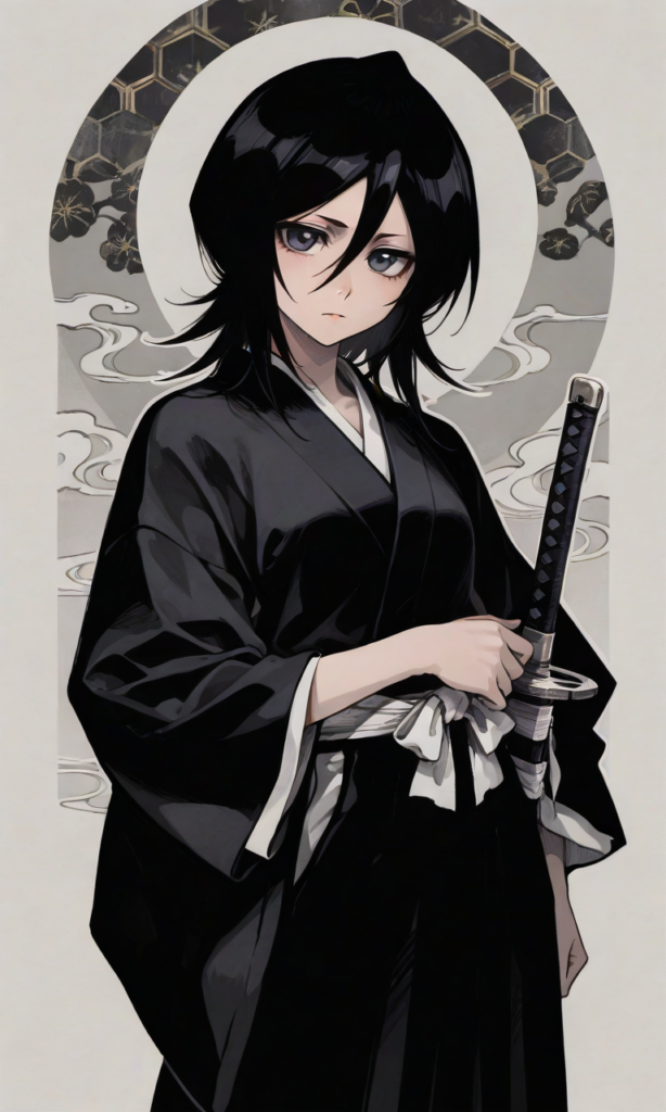 PixAI【Shiitake-Mix】kuchiki rukia(bleach),black kimono,looking at viewer,katana, hand on own hip, cowboy shot,japanese pattern background, minimalism, masterpiece,high resolution,high quality, ,high-res,748cmstyle,((sketch-like_outlines, watercolor_coloring, watercolor_texture, japanese_style, best_quality, ultra_detailed, lineart-heavy_style, sketch_style))