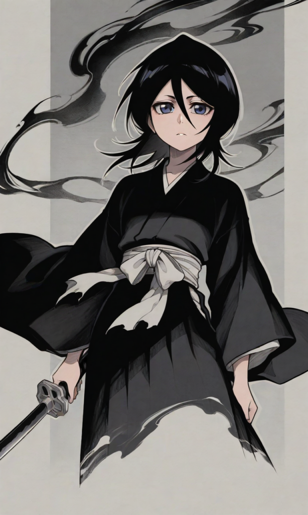 kuchiki rukia(bleach),black kimono,holding katana,cowboy shot,masterpiece,high resolution,high quality, ,high-res,Black and Grey, crosshatching, dark aesthetic, clean, background texture, bold outline, abstract, cropped, cropped background, ultra detailed