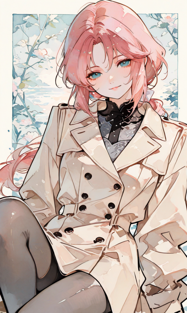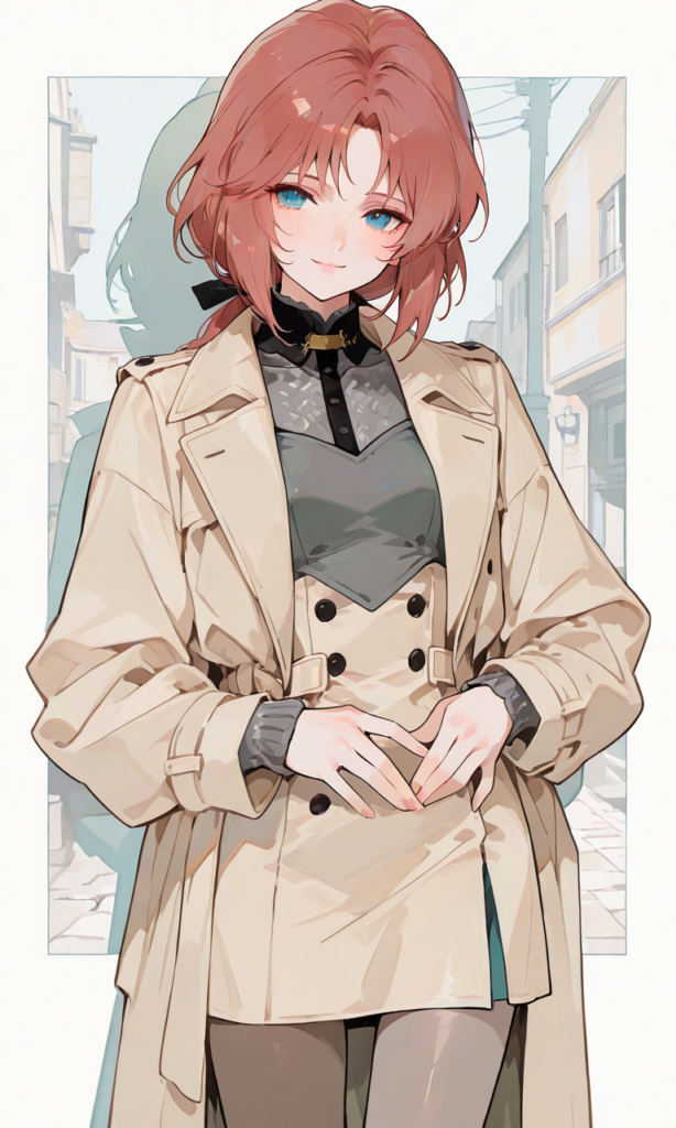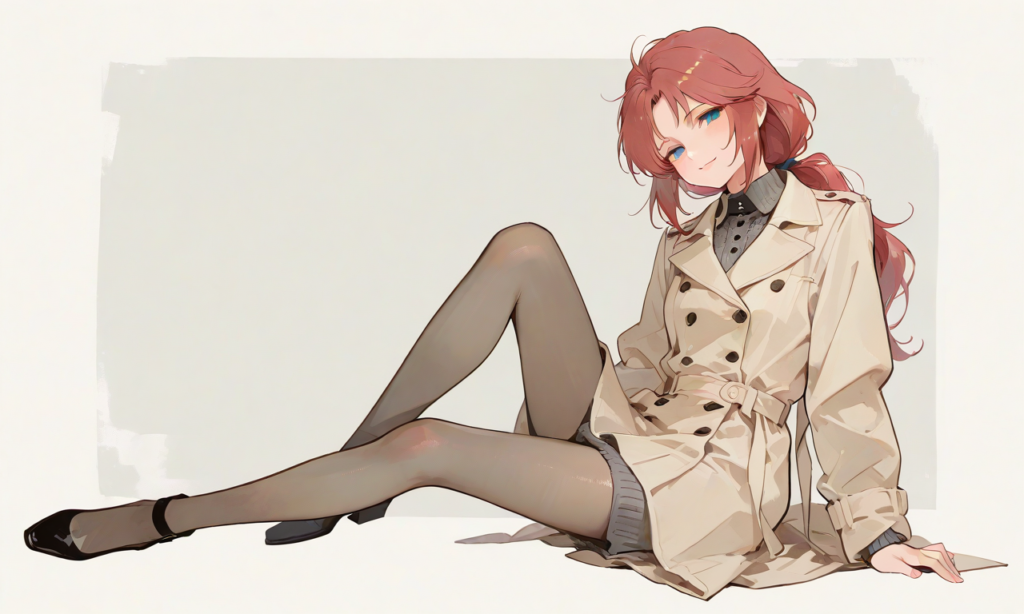 marida cruz(gundam unicorn), 1girl, (low ponytail), light smile, (long beige trench coat:1.4), double-breasted buttons, wide lapel collar, soft fabric texture, (gray knit mini dress:1.3), high neckline, long sleeves, slim silhouette, pantyhose, (feminine style:1.2), (elegant street fashion), cowboy shot, three quarter view, knee up, masterpiece, high resolution, high quality, high-res, 748cmstyle, ♡masterpiece, highest quality, ♡, (sketch-like_outlines, watercolor_coloring, watercolor_texture, japanese_style, best_quality, ultra_detailed, lineart-heavy_style, sketch_style)
