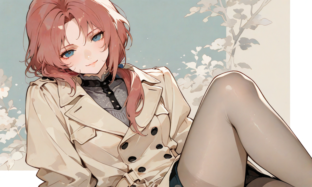 PixAI【Shiitake-Mix】marida cruz(gundam unicorn), 1girl, ((low ponytail)), light smile, (long beige trench coat:1.4), double-breasted buttons, wide lapel collar, soft fabric texture, (gray knit mini dress:1.3), high neckline, long sleeves, slim silhouette, pantyhose, (feminine style:1.2), (elegant street fashion), cowboy shot, three quarter view, knee up, masterpiece, high resolution, high quality, high-res, 748cmstyle, masterpiece, highest quality