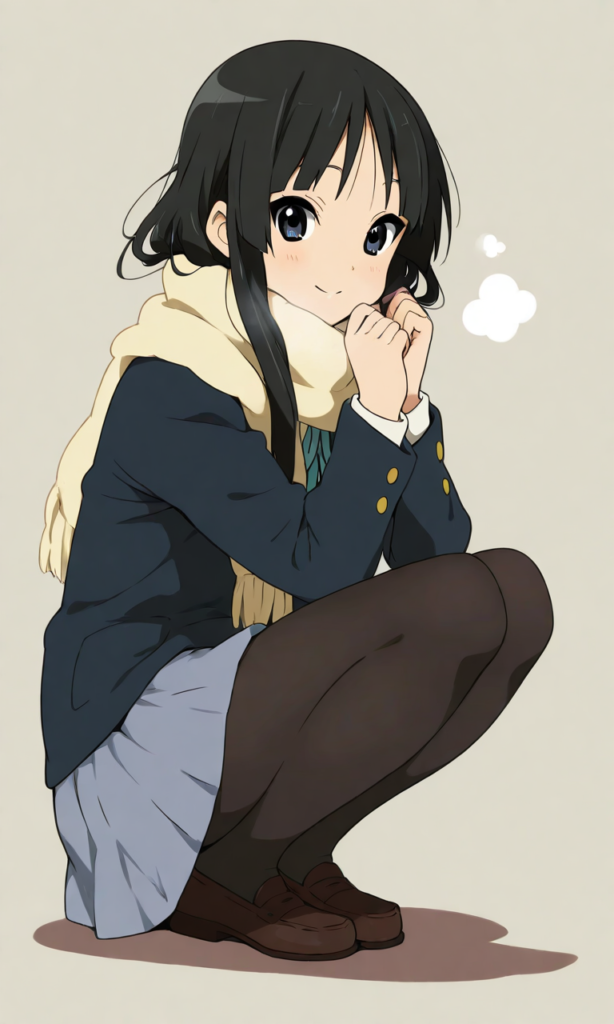 akiyama mio (k-on!), 1girl, school uniform, blazer, scarf, pantyhose, squatting, smile, masterpiece, high resolution, high quality, ultra detailed