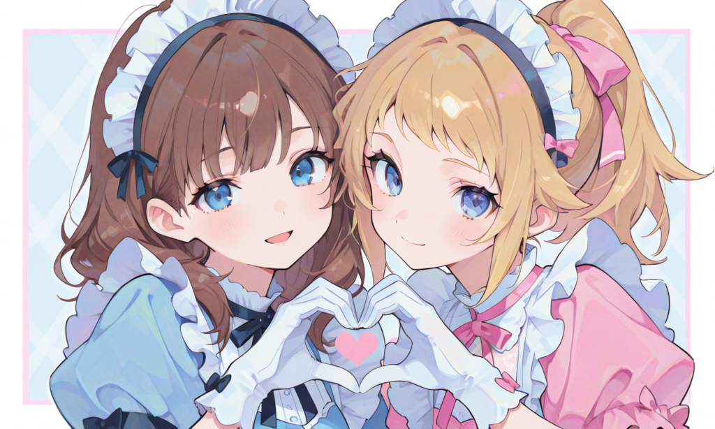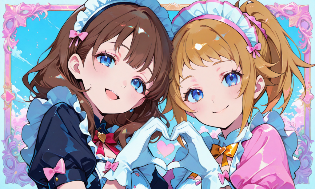 PixAI【Hoshino v2】2girls, hoshino fumina(blue eyes,ponytail), sakuma mayu((tareme)), maid, puffy short sleeves, white gloves,smile,open mouth,heart hands, upper body, masterpiece,high quality, high resolution,high-res,neon pop art style,♡masterpiece, highest quality, ♡,(watercolor_(medium):1.2)(simple coloring,flat color:2)dutch angle,hyper-detailed, high contrast, depth of field, ray tracing, best lighting, cinematic composition, beautiful face, beautiful eyes, sharp focus, (masterpiece:1.2), (best quality:1.2), (very aesthetic:1.2), (absurdres:1.2), (detailed background),