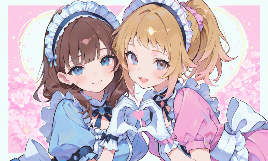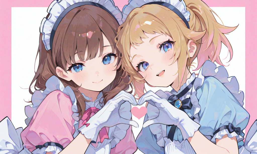 【Haruka v2】2girls, hoshino fumina(blue eyes,ponytail), sakuma mayu((tareme)), maid, puffy short sleeves, white gloves,smile,open mouth,heart hands, upper body, masterpiece,high quality, high resolution,high-res,neon pop art style,♡masterpiece, highest quality, ♡,(watercolor_(medium):1.2)(simple coloring,flat color:2)dutch angle,hyper-detailed, high contrast, depth of field, ray tracing, best lighting, cinematic composition, beautiful face, beautiful eyes, sharp focus, (masterpiece:1.2), (best quality:1.2), (very aesthetic:1.2), (absurdres:1.2), (detailed background),