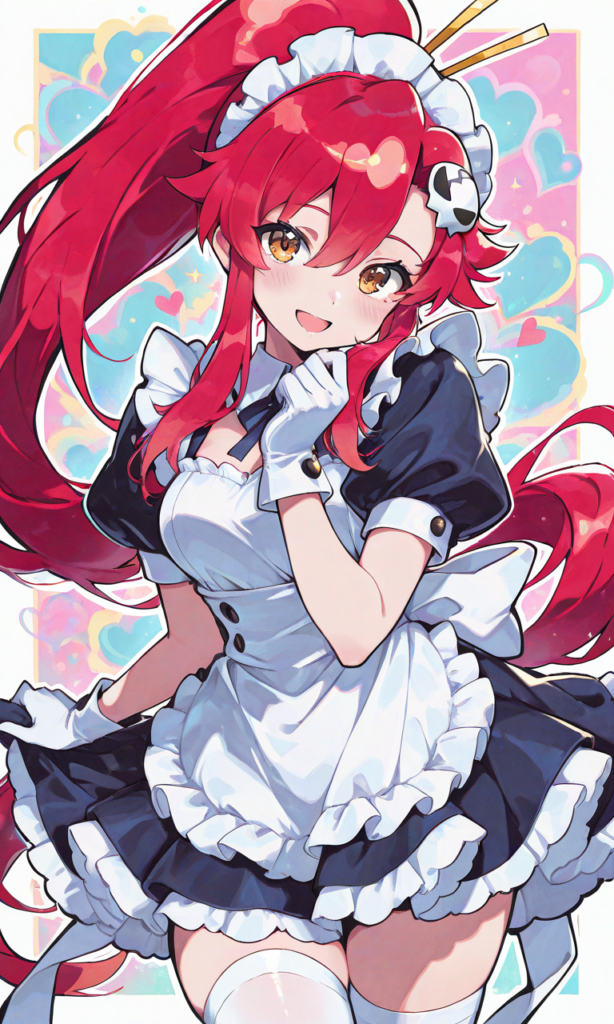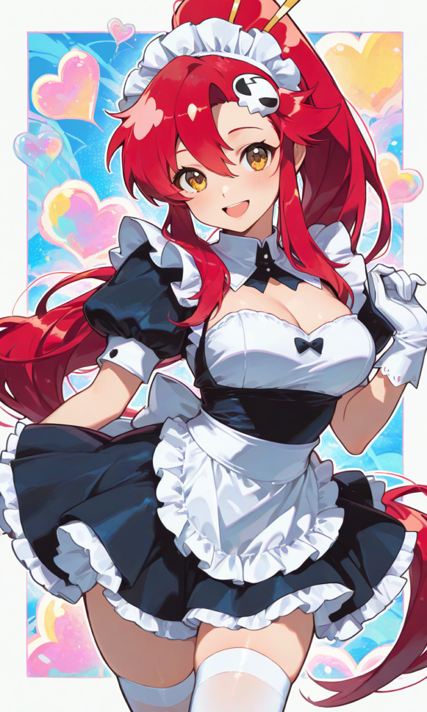 gurenragan,yoko littner,maid,puffy short sleeves, white gloves, white thighhighs, smile,open mouth, cowboy shot, masterpiece,high quality, high resolution,high-res,pop art background,♡masterpiece, highest quality, ♡,