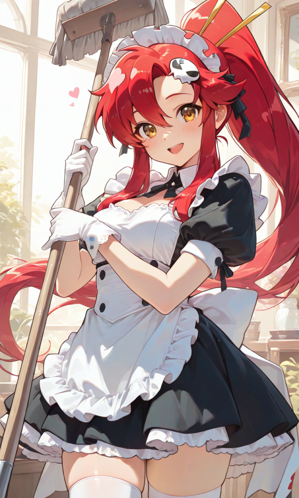 gurenragan,yoko littner,maid,puffy short sleeves, white gloves, white thighhighs, smile,open mouth,holding, mop, cowboy shot, masterpiece,high quality, high resolution,high-res,♡masterpiece, highest quality, ♡,