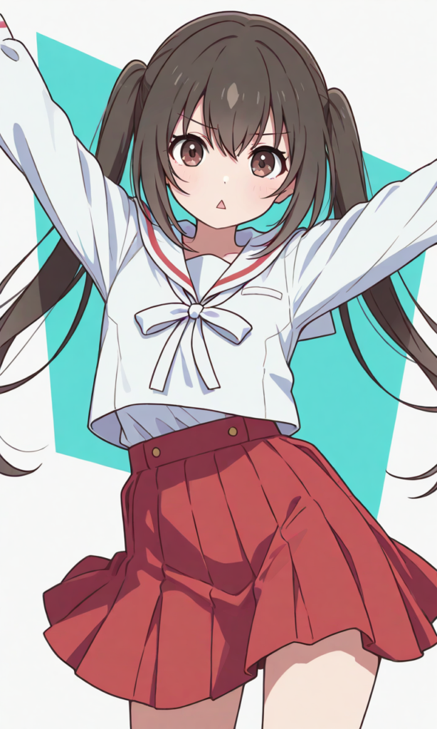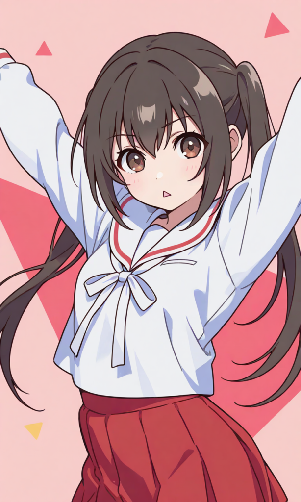 PixAI【Shiitake-Mix】flat color, cel shading, minami kana,solo,brown eyes, white serafuku,long sleeves, red skirt,white neckribbon,smugness,triangle mouth,looking at viewer,arms up,((spread arms)), ,skipping, cowboy shot, masterpiece,high quality, high resolution,high-res,