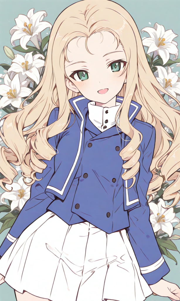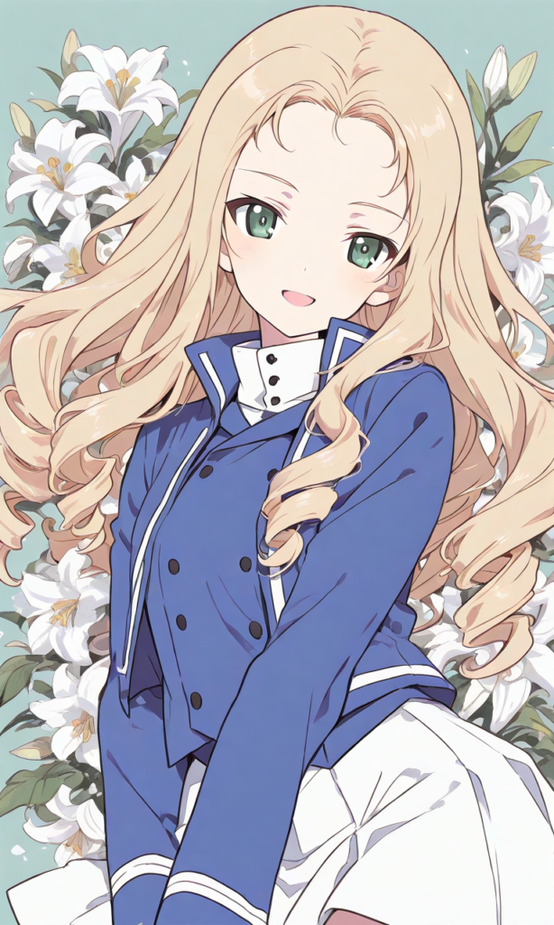 PixAI【Shiitake-Mix】shimada fumikane (style), marie (girls und panzer),hair slicked back, green eyes,blonde hair, bc freedom military uniform, white skirt, smile,open mouth, cowboy shot,white lily, masterpiece,high quality, high resolution,high-res,♡masterpiece, highest quality, ♡,(watercolor_(medium):1.2)(simple coloring,flat color:2)dutch angle,marie (girls und panzer), bc freedom military uniform, bc freedom (emblem), drill hair, blonde hair, green eyes, long hair,